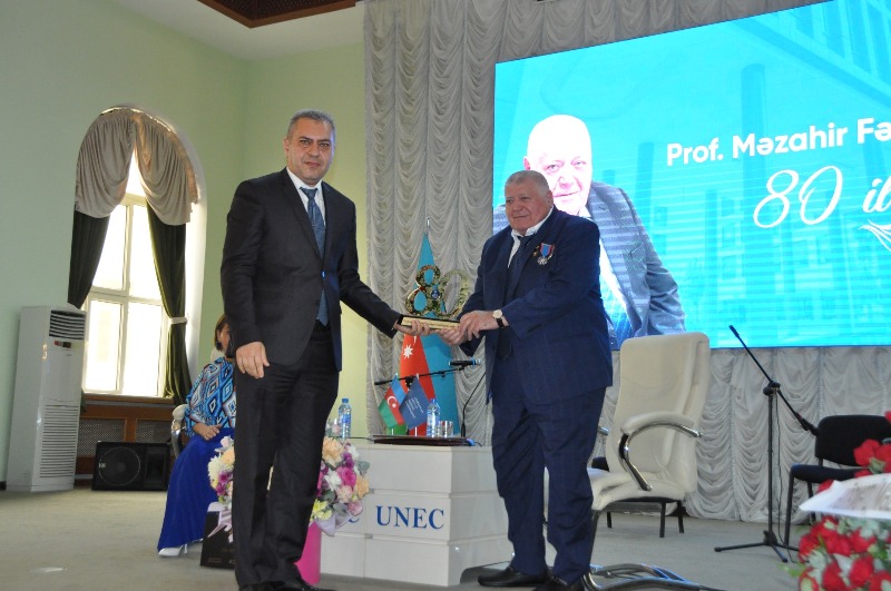 Yubiley münasibətilə professor Məzahir Fərzəliyevə UNEC rəhbərliyi və kollektiv adından xatirə hədiyyələri təqdim olunub.