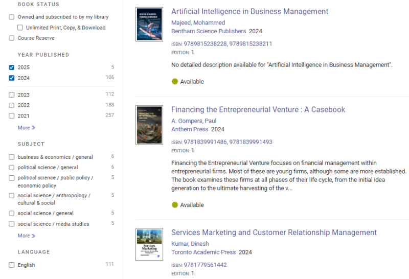 UNEC-in abunə olduğu ProQuestEbookCentral (https://ebookcentral.proquest.com/lib/azerbastat/home.action) bazası üzrə Süni İntellekt (Sİ) mövzusunda araşdırma apardıq. Qeyd edim ki, bazada əsasən dünyanın bir çox nəşriyyatlarında çap edilmiş müxtəlif sahələr üzrə e-kitablar təqdim edilir. Bazada Sİ üzrə 22539 kitab var. Son on illik dövr üzrə apardığımız təhlilin nəticəsinə əsasən bazada 7015 e-kitab aşkar edilib ki, bu kitabların da 1500-ə qədəri iqtisadiyyatın müxtəlif sahələrini əhatə edir. Mövzu üzrə kitabların əksəriyyəti- 6938-i ingilis dilində, 22-si fransız, 21-i alman, 20-si ispan dilində, qalan qismi isə tək-tək olmaqla müxtəlif dillərdədir.